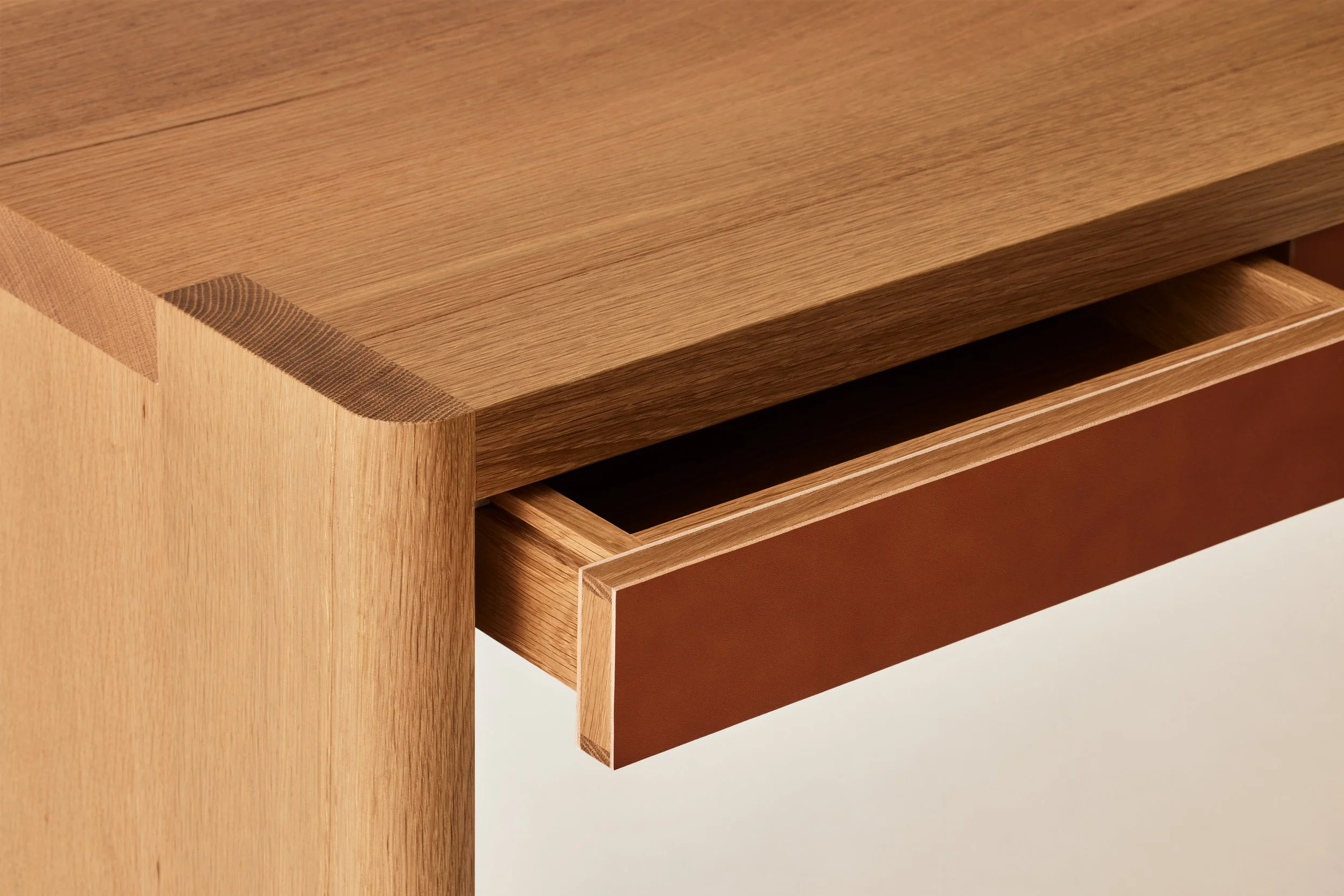Drawer detail of Francis Desk in Natural White Oak and Saddle Leather