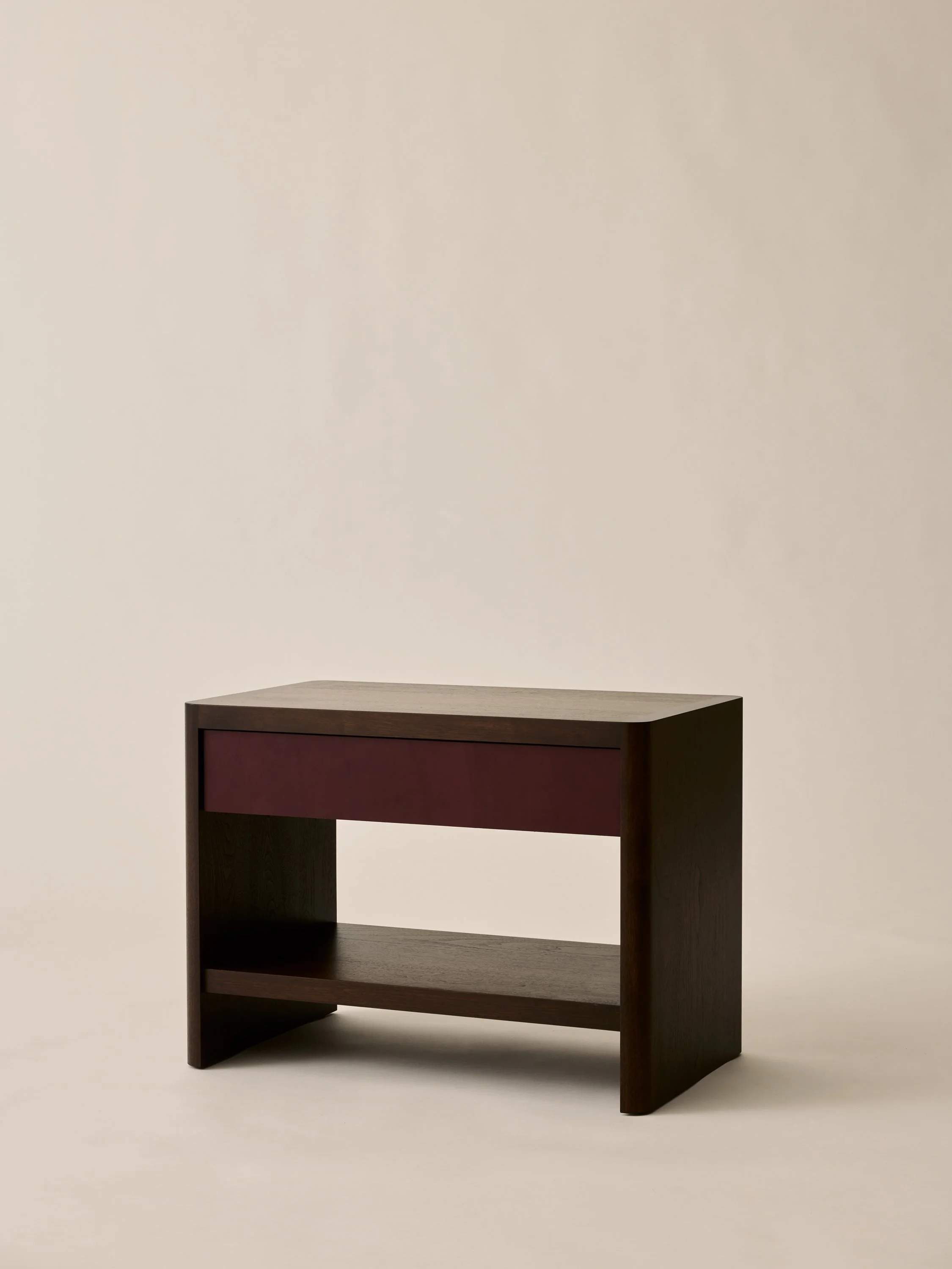 Francis Nighstand with Shelf in Blackened Walnut and Oxblood Leather