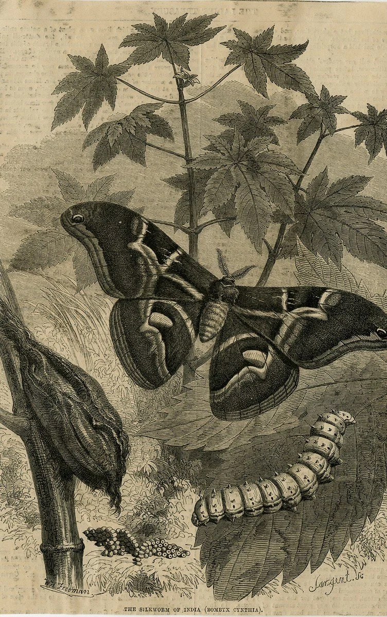 'The silkworm of India' - Depiction of the different stages of the silkworm by Alfred Louis Sargent (1828-1855) from The Illustrated London News