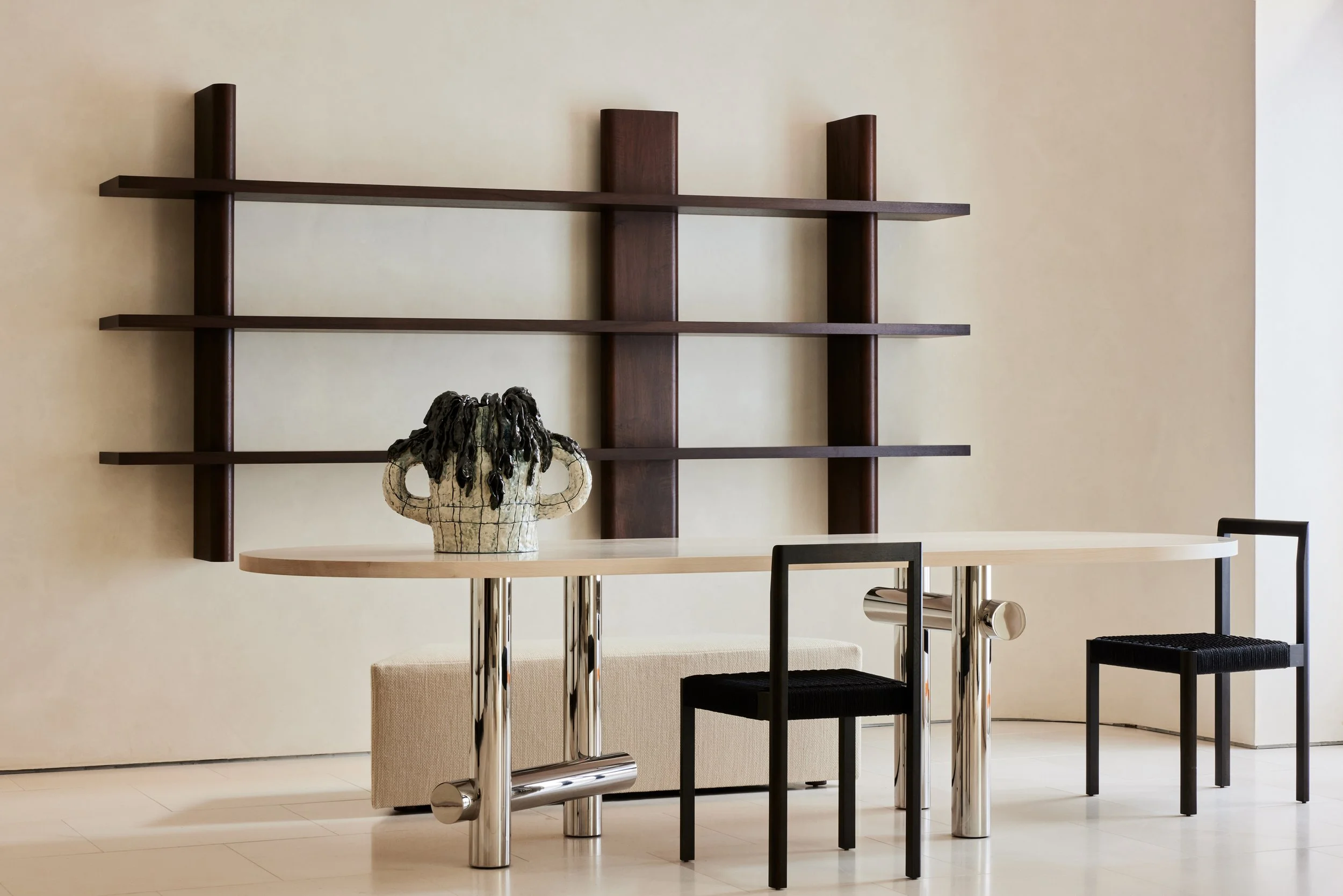 Long Live Edge Kenny Dining Table in one-of-a-kind Willow Slab with Densen Chairs + Bench, Fortune Console + Shelf, ceramics by Natasha Alphonse, woodblock print by Hildegarde Haas and sculpture by Julian Watts