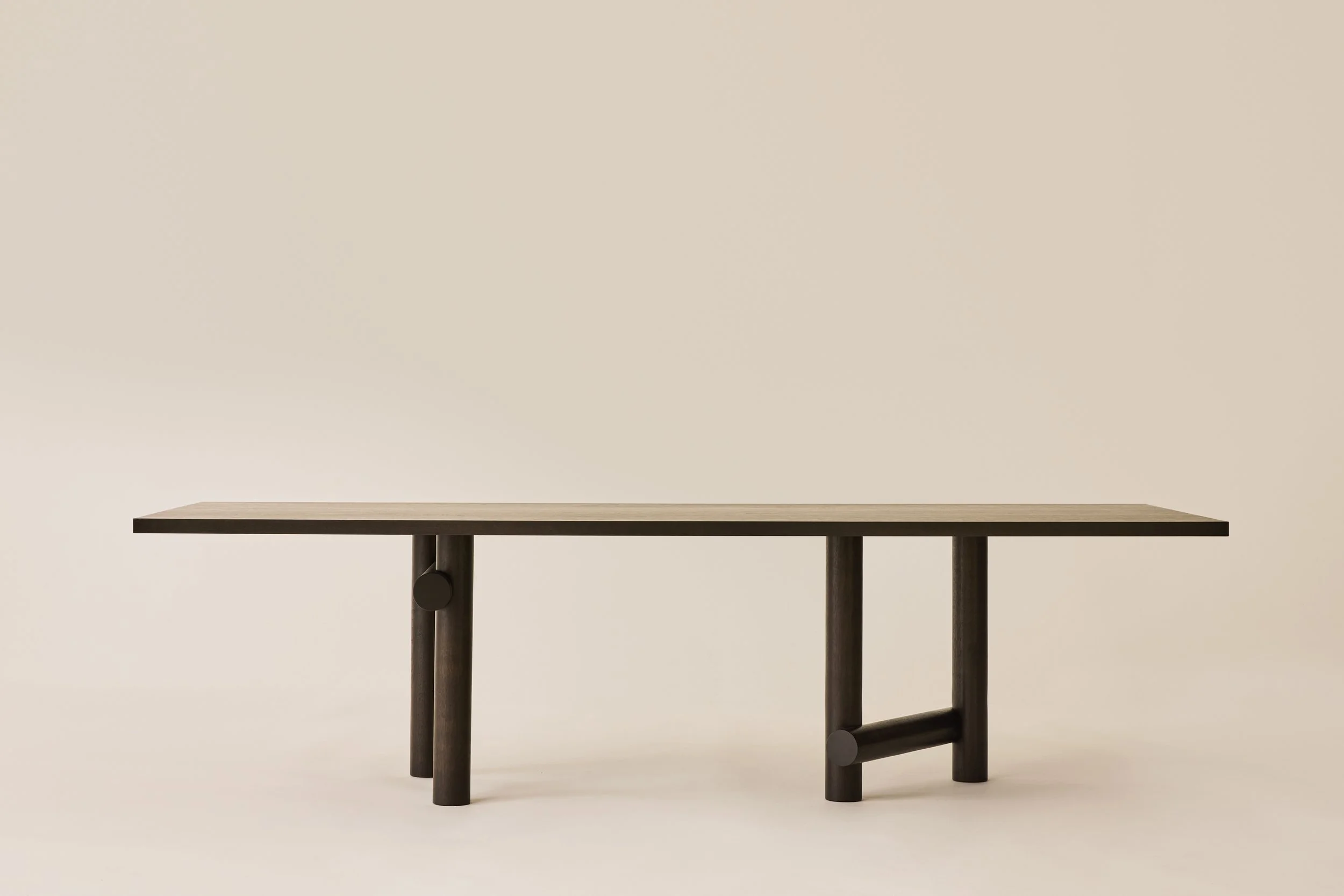 Round Kenny Dining Table in Blackened Walnut with Court Chair, RBS Nopal Chandelier, Crain Bar, Phillips Credenza, and unique vessel by Caroline Blackburn