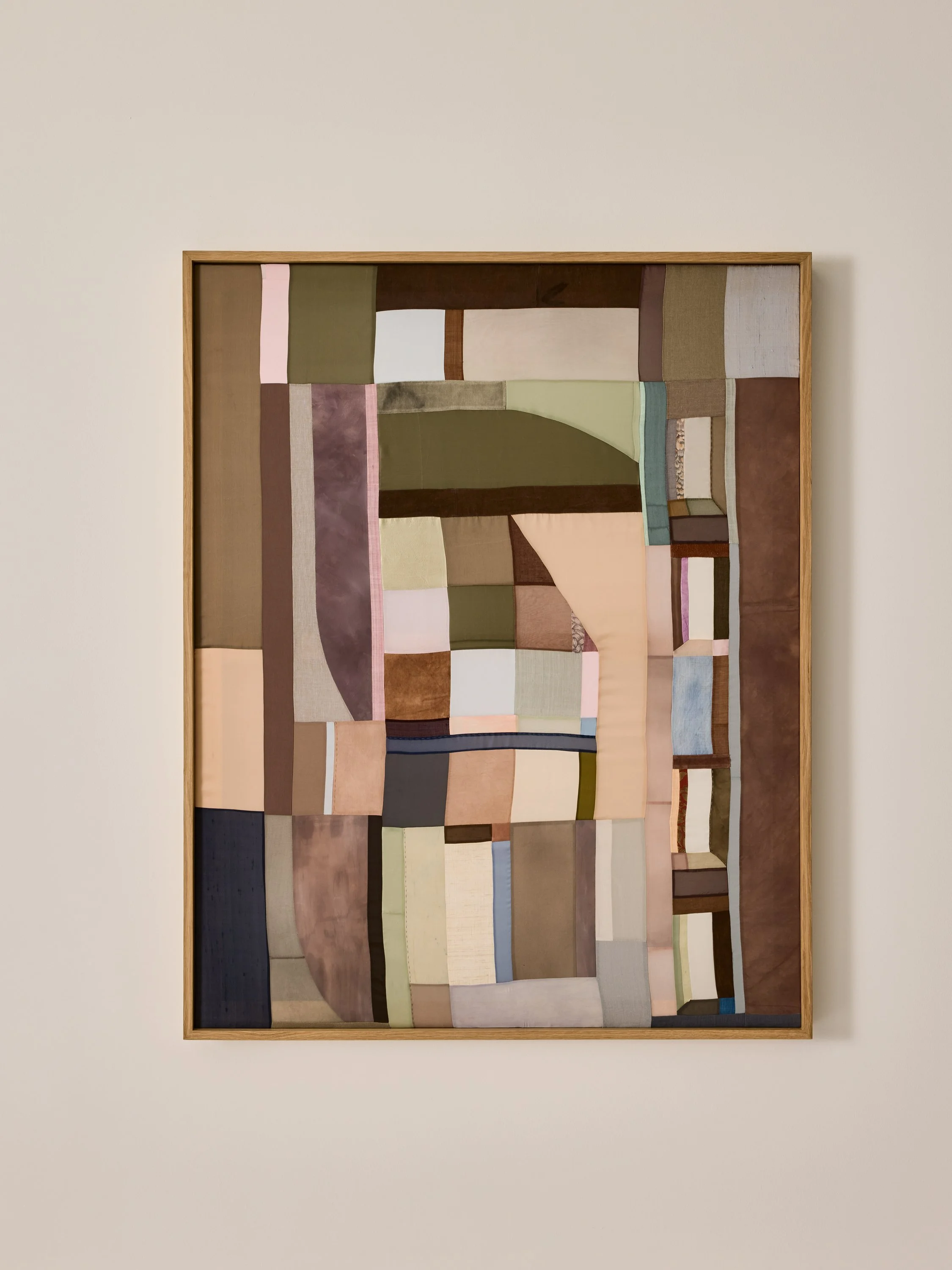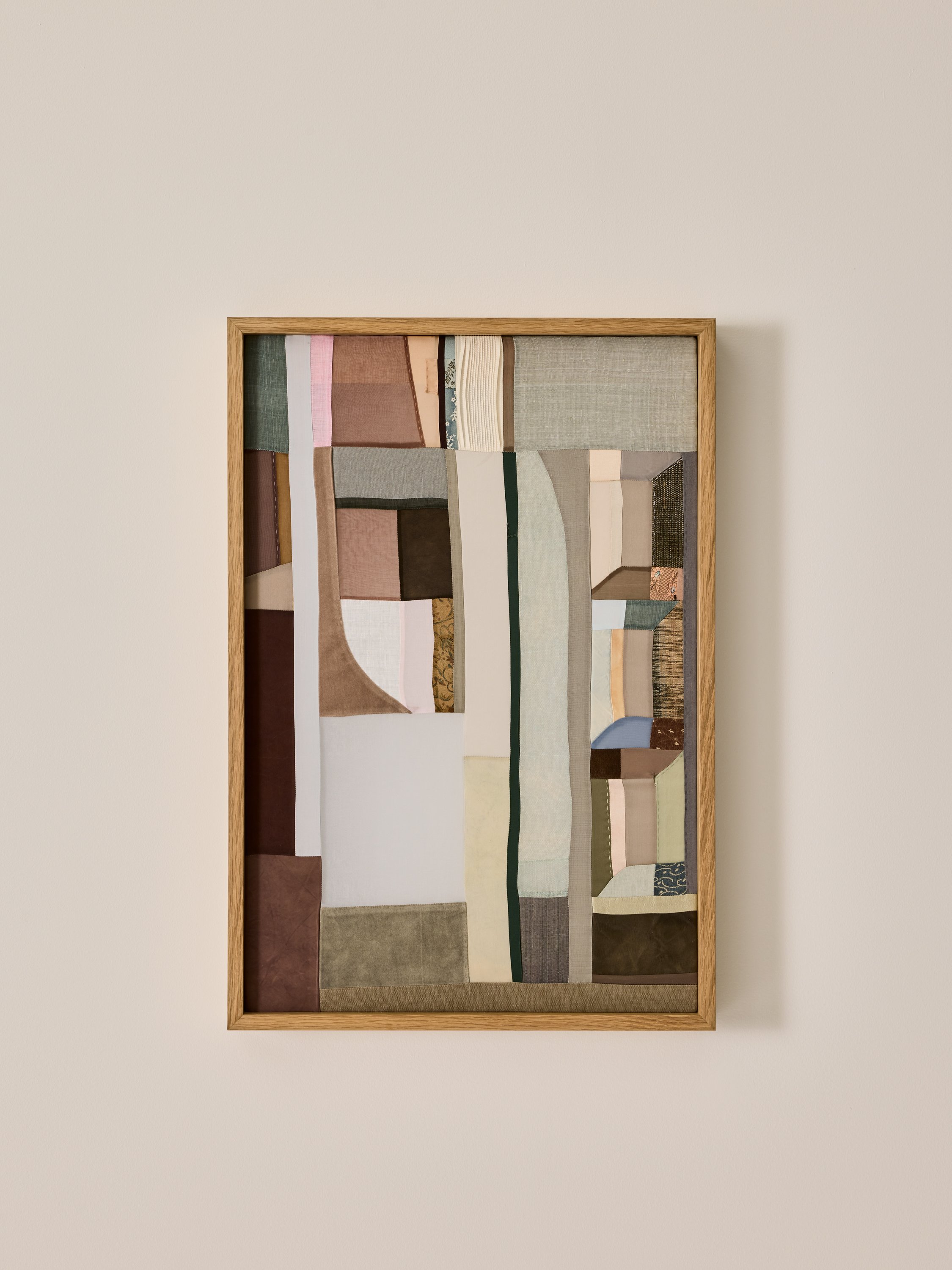 Yarn dyed European linen, naturally dyed cotton velvet, silk and linen using Walnut, Acacia and Sequoia, Quebracho, Sappan wood. Embroidery and hand quilting details. Antique Japanese woven fabric, Antique printed french floral and Collected Korean Rami fabrics. White Oak frame with hand wax finish, backed with Acid Free Swiss cotton organdy for protection.