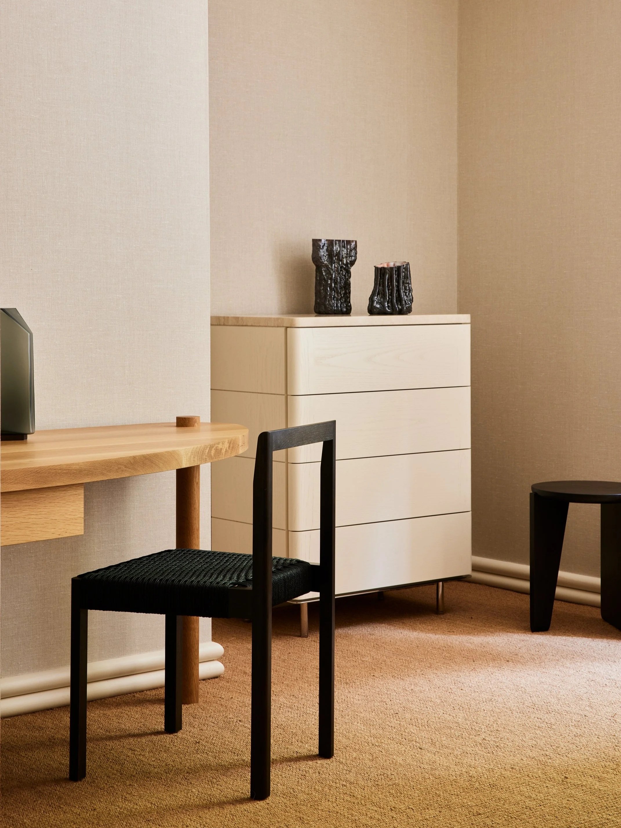 Ritter Chest in Dove lacquer, Travertine top and Polished Stainless Steel base with Densen Chair, Martie Desk, Tyler Table Lamp, Wu Side Table and unique vessels by Jeff Martin