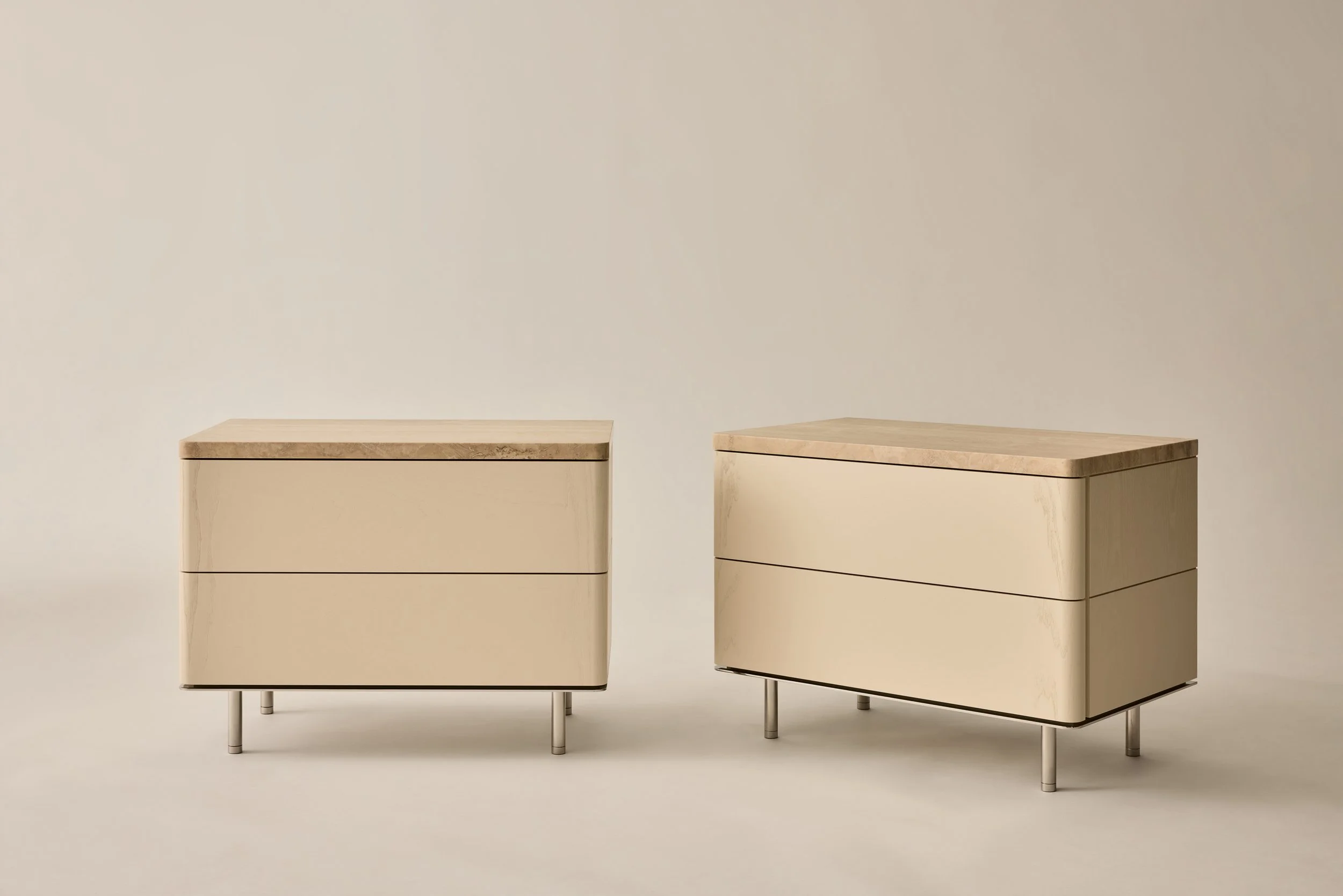 Ritter Nightstands in Bone Lacquer, Travertine and Stainless Steel