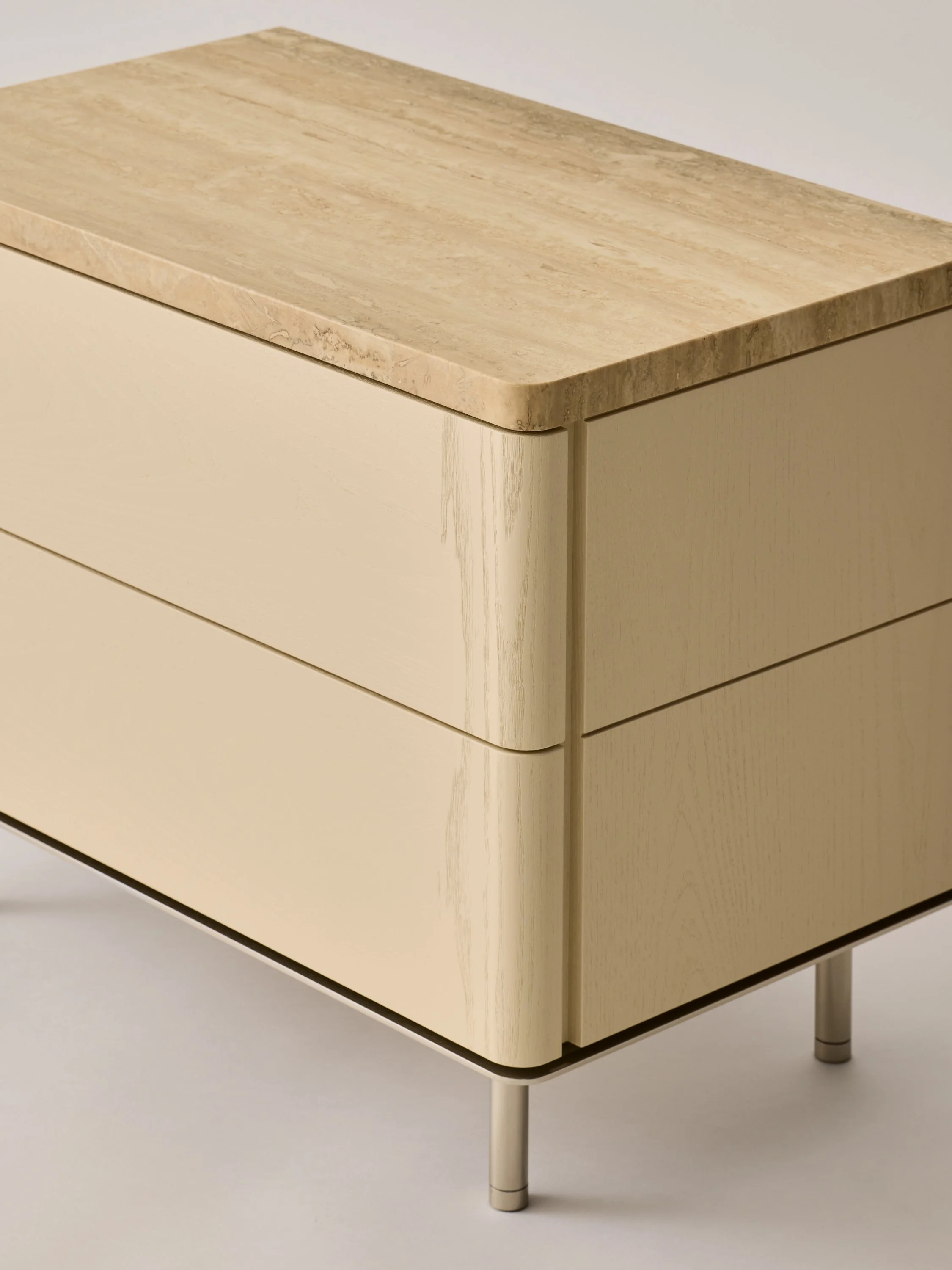 Detail of Ritter Nightstand in Bone Lacquer, Travertine and Stainless Steel